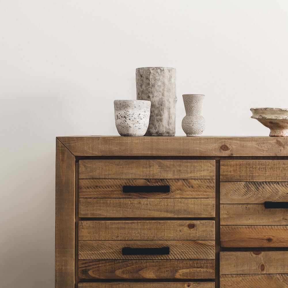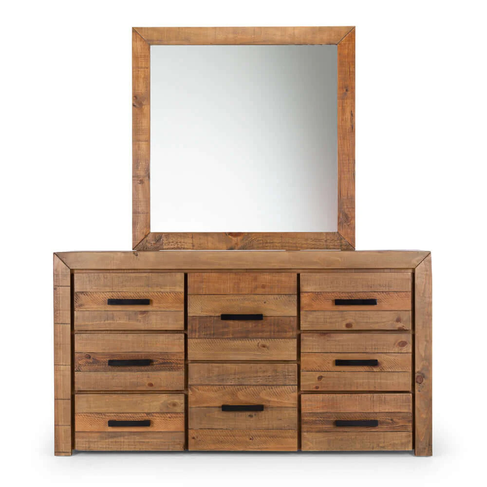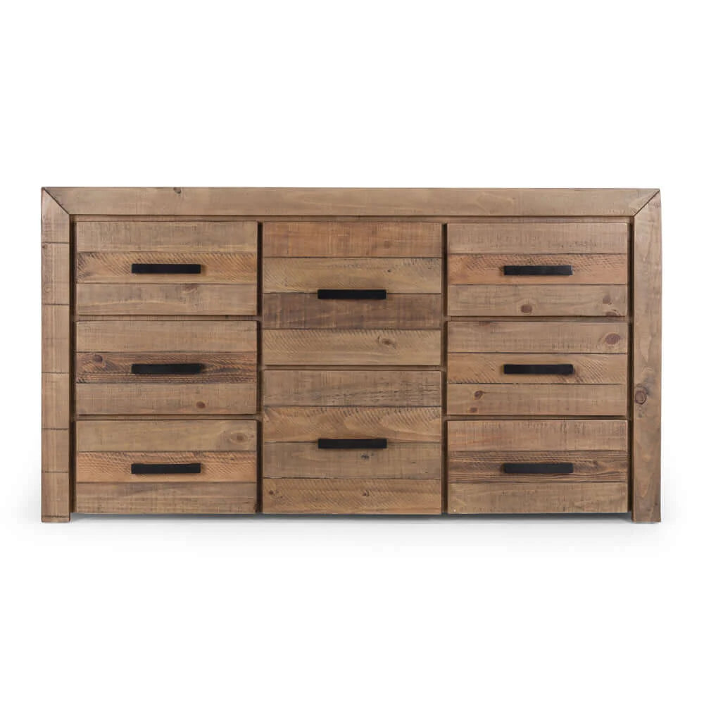 Our handsome Raglan Dresser is rustic and chunky with plenty of drawer space. Crafted with unsorted timber and adorned with brushed black metal handles, our Raglan range has a rustic/raw look and is enhanced with knots, splits, and waney edges, giving it a gorgeous natural look. The drawers also feature telescopic runners for ease of use.