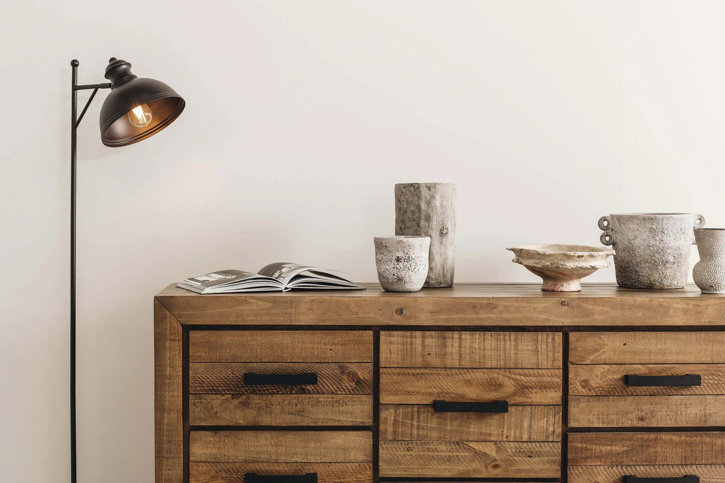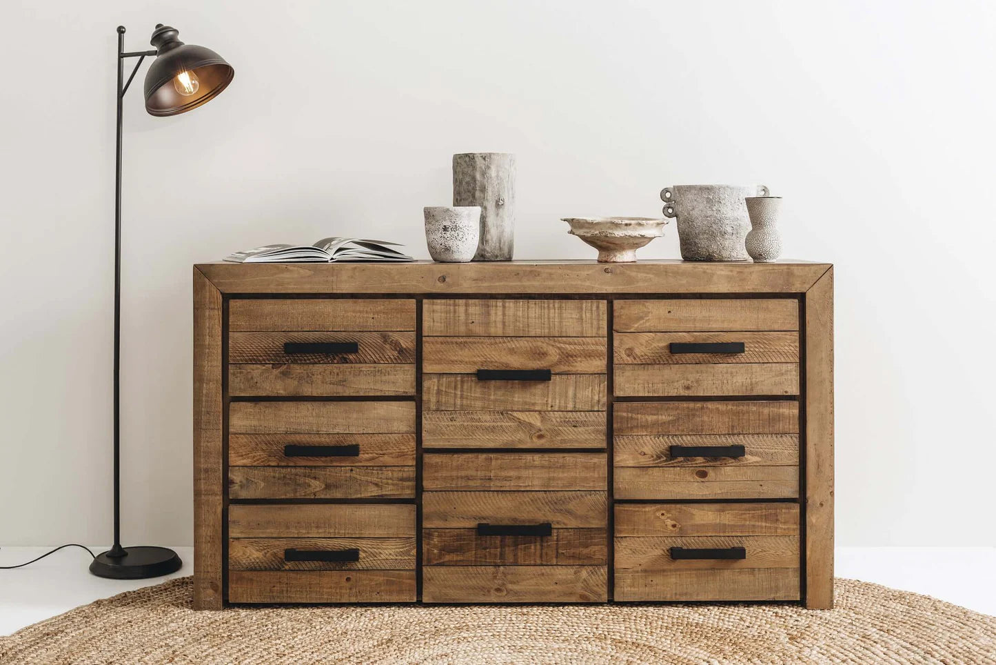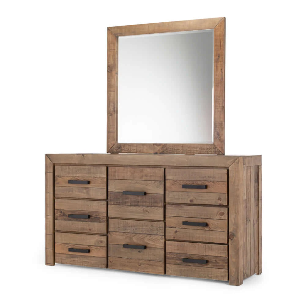 Our handsome Raglan Dresser is rustic and chunky with plenty of drawer space. Crafted with unsorted timber and adorned with brushed black metal handles, our Raglan range has a rustic/raw look and is enhanced with knots, splits, and waney edges, giving it a gorgeous natural look. The drawers also feature telescopic runners for ease of use.