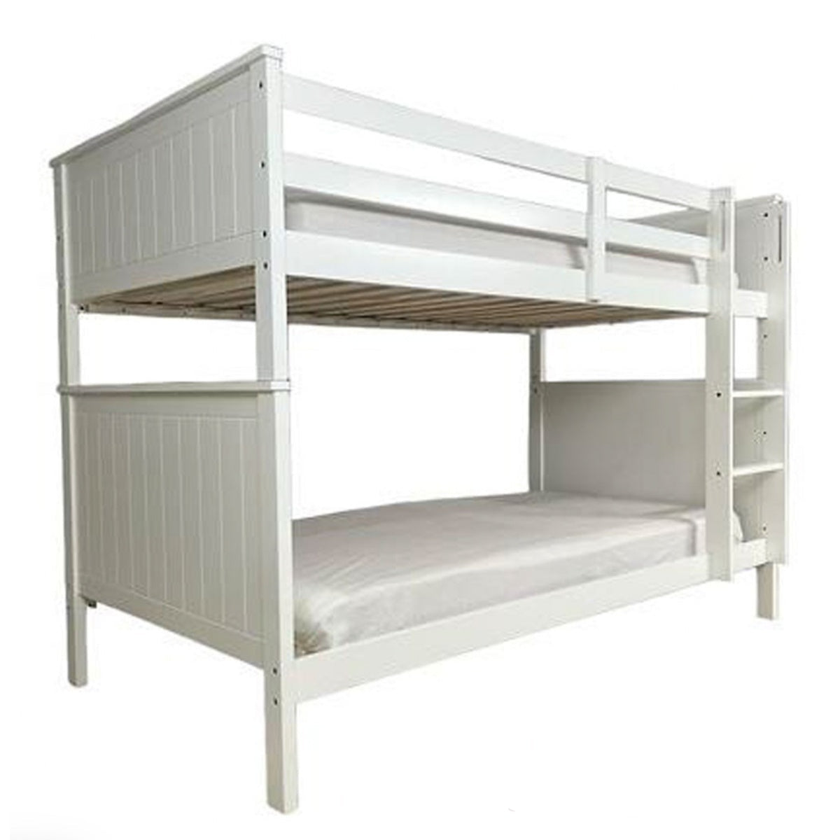 The Ava bunk set includes a fixed strong 3-step ladder, wooden slat base, and meets NZ, Australia & UK safety standards. It has tongue and groove effect panel ends. Plus, there's plenty of headroom between the top and bottom bunks (850mm, excluding mattresses). Each level can hold up to 110kg with an innerspring mattress. Please note: Mattresses sold separately.