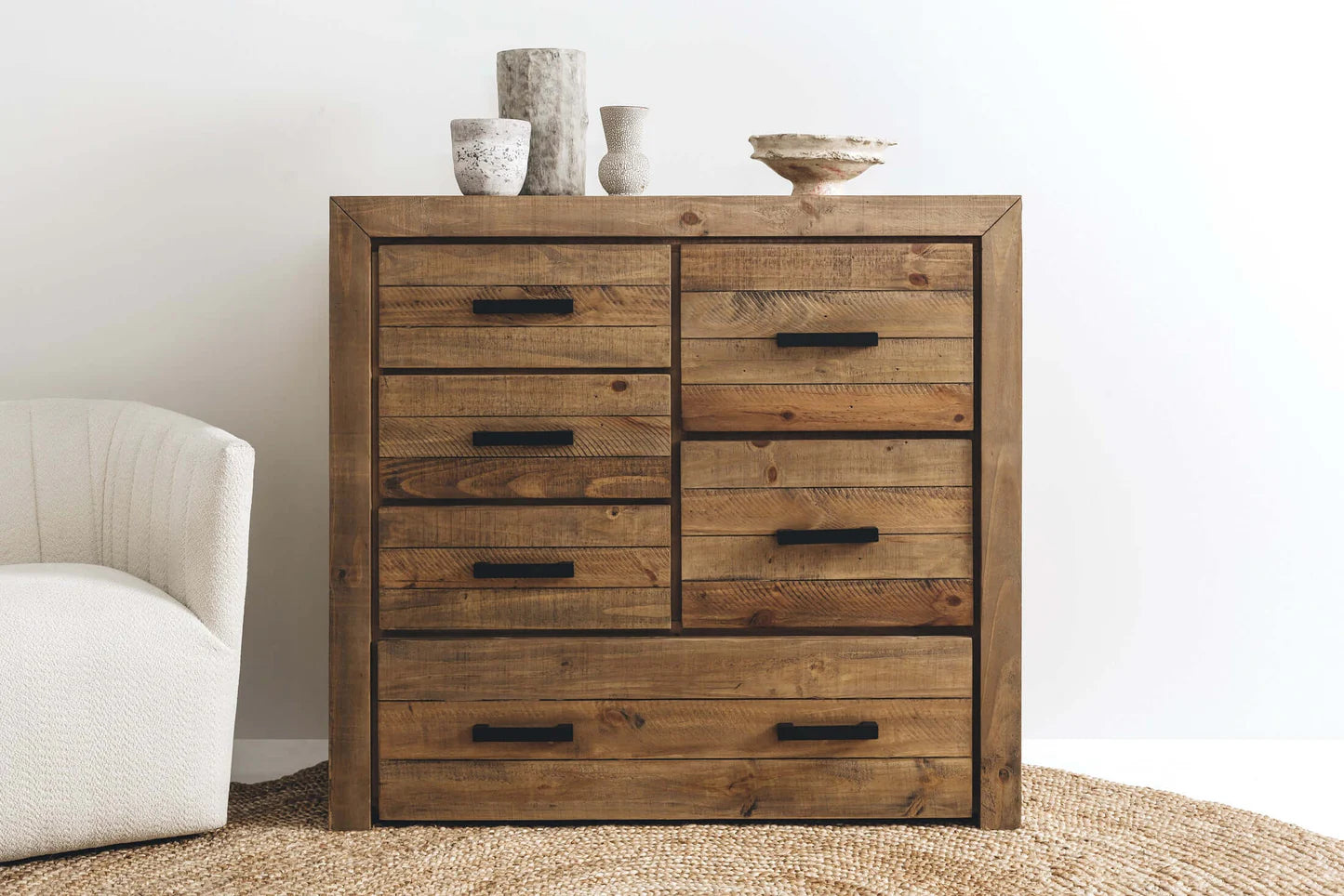 Our handsome Raglan range are rustic and chunky with plenty of drawer space. Crafted with unsorted timber and adorned with brushed black metal handles, our Raglan range has a rustic/raw look and is enhanced with knots, splits, and waney edges, giving it a gorgeous natural look. The drawers also feature telescopic runners for ease of use.